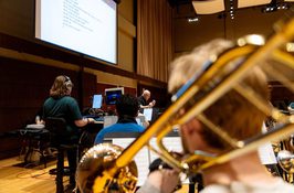 See photos from an orchestra rehearsal .